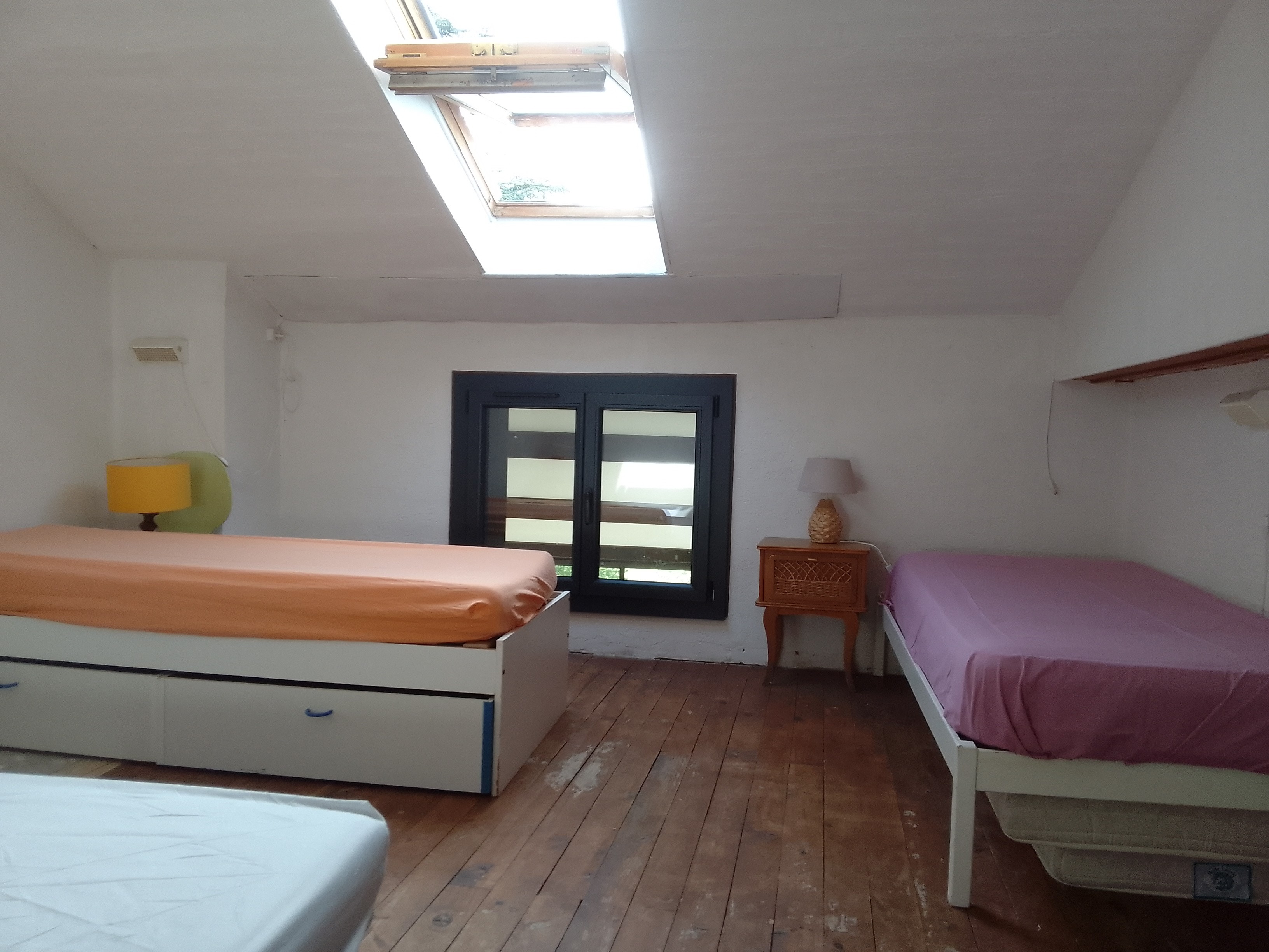 On pénètre dans la lumineuse et grande soupente en passant sous une toute petite porte. Equipée de 4 couchages (1 lit double et 2 lits simples), cette chambre est bien adaptée pour les familles et les petits groupes d'ami.e.s.