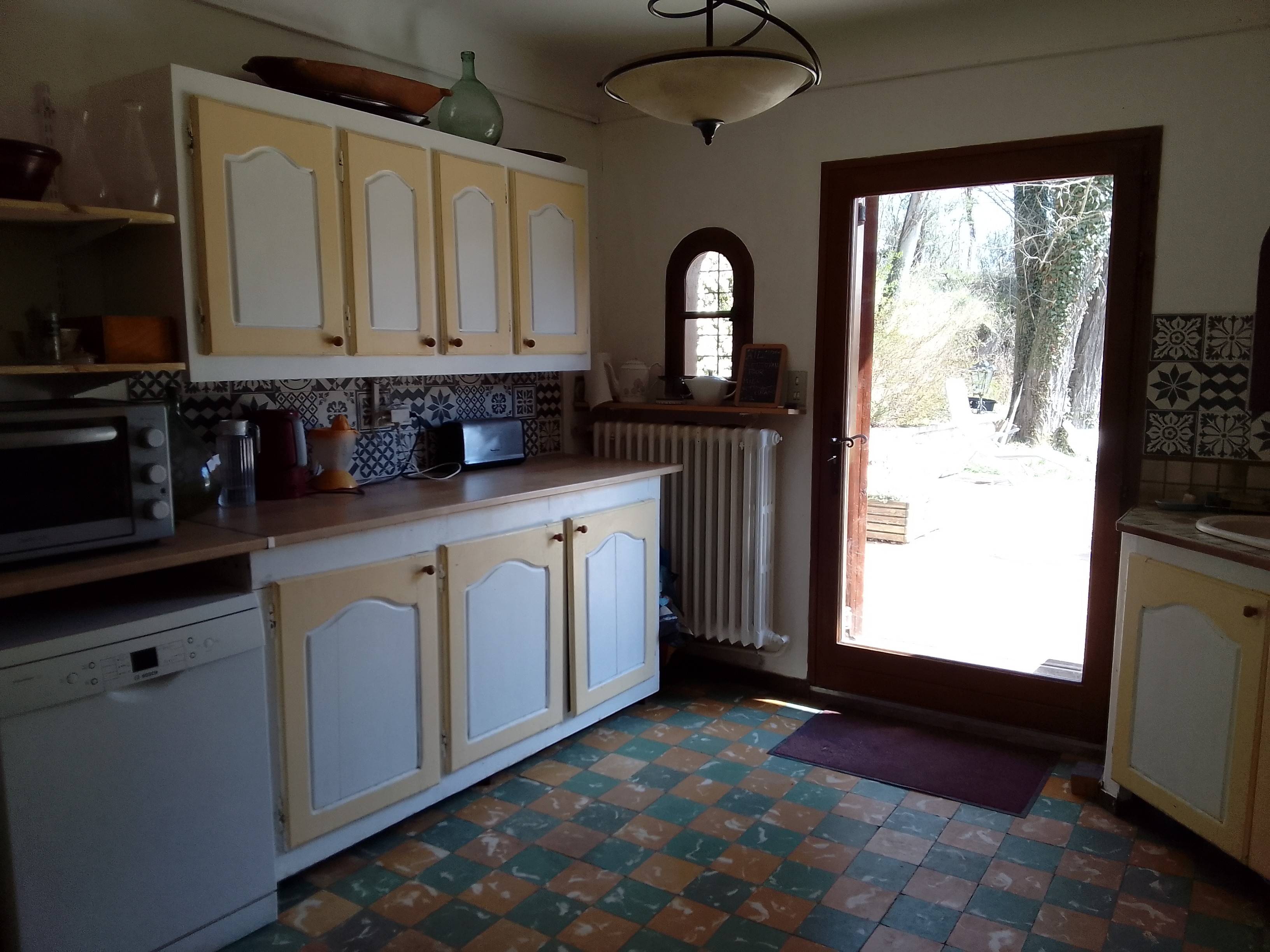 Enfin, la cuisine donne d'un côté sur la salle à manger, de l'autre sur la terrasse, facilitant ainsi les repas en intérieur ou en extérieur selon la saison.